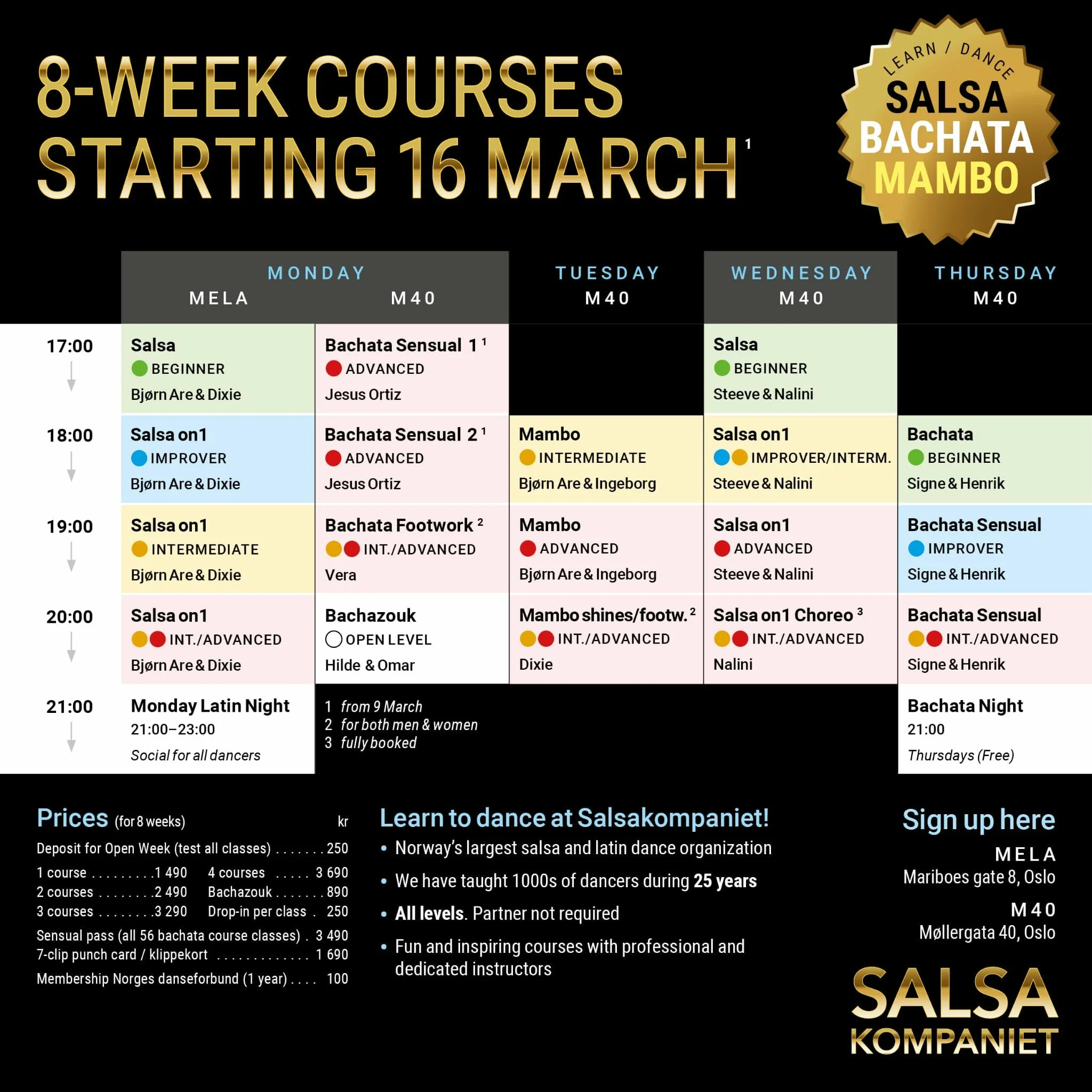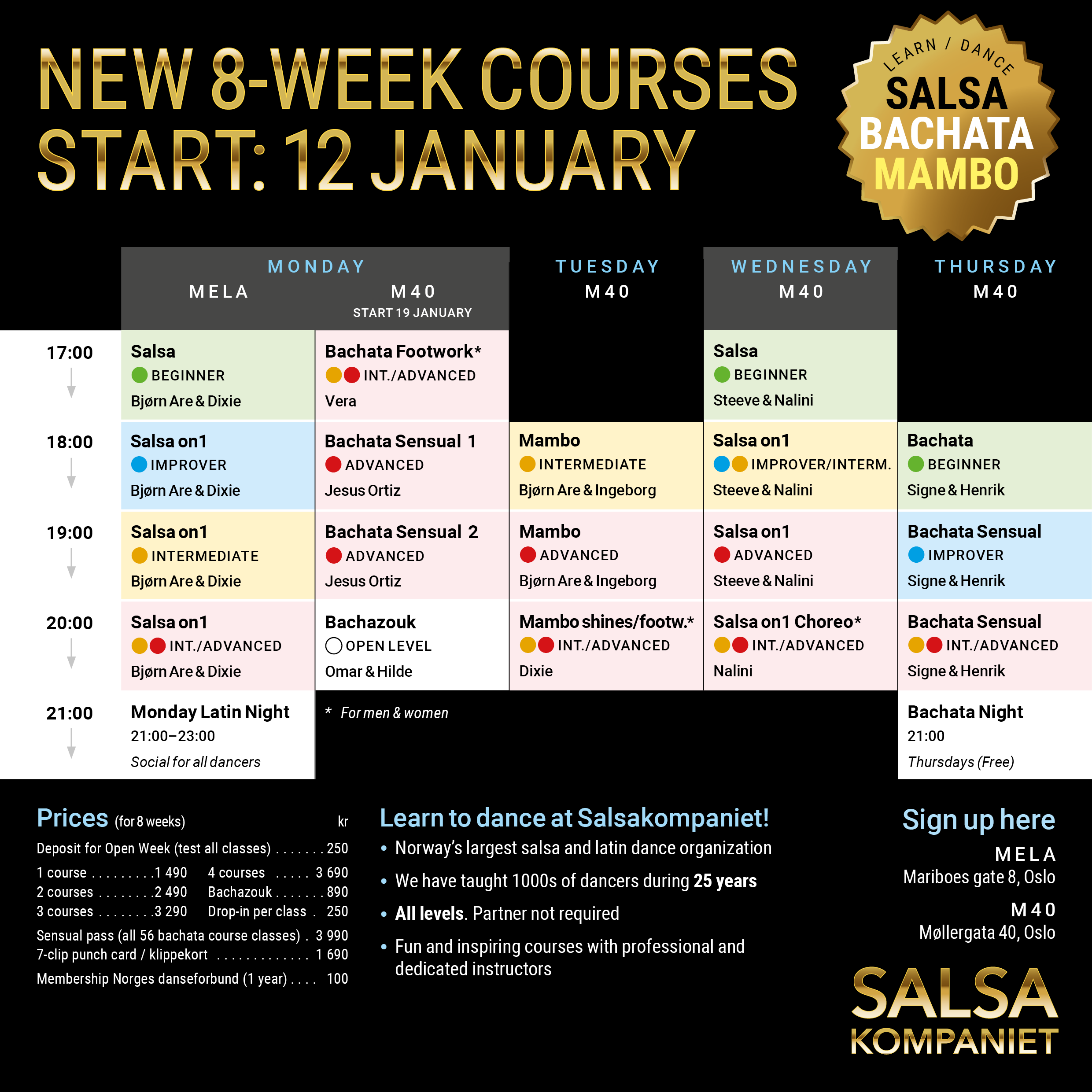 Kurskort / Course card: With a course card, you sign up for one (or several) specific class(es) per week, for the whole duration of the 8-week course. Showing up for the class(es) you have signed up for is your responsability. The only acceptable reason for changing course day/taking the course later is by showing documentation from your doctor that you where unable to attend due to illness/injury. This can be sent to: morten@salsakompaniet.no.